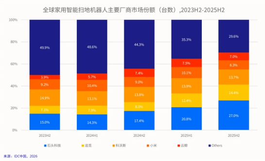据国际数据公司IDC发布最新的《全球家用智能清扫机器人市场跟踪报告》的最新数据显示,2025年全球清洁机器人市场总出货量达到3272万台,同比增长20.1%;其中扫地机器人依旧是最大品类,全年出货2412万台,同比增长17.1%。
